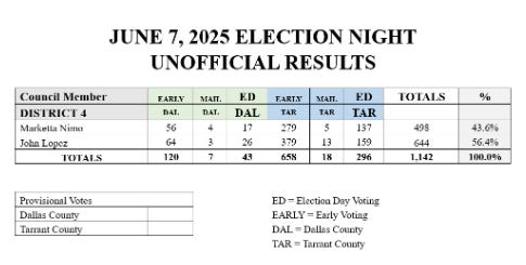 District 4’s totals ended up in a runoff between Marketta Nimo and John Lopez, here are the results of that runoff:
