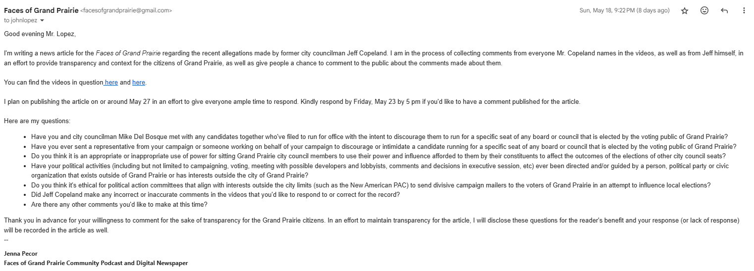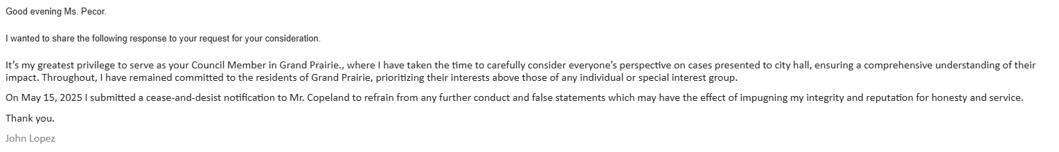 After reading both the statement from Mr. Lopez and the cease and desist letter from his attorney, it’s clear that the most important thing to him is his good reputation…..not correcting statements that were wrong, not rejecting the idea directly that he’d ever manipulate an election behind the scenes, and not distancing himself from Del Bosque and his actions. He doesn’t appear to understand why his reputation is being tarnished - it’s not because of Mr. Copeland, it’s because the things Mr. Lopez is being accused of doing are serious things that voters in Grand Prairie find unseemly and unethical. There’s no doubt Mr. Lopez has amassed a very good reputation with many Grand Prairie voters over in the past several years, this is why many people were shocked by Mr. Copeland’s comments. The Faces of Grand Prairie, in its attempts to be a fair publication that respects his good reputation, gave Mr. Lopez the opportunity, through the questions provided, to distance himself from all the accusations from the video, and while he did respond to our request for comment, he didn’t address any of the questions directly.