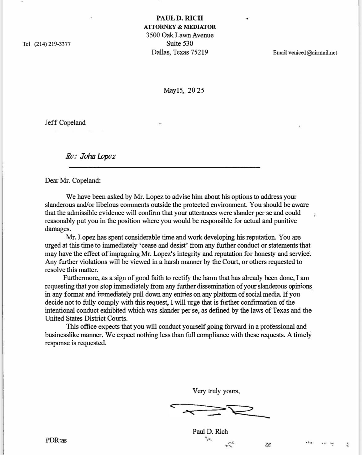 I confirmed with Mr. Copeland that he did receive a cease and desist letter from Paul Rich. Esq, whose active Linked In profile lists experience with the Law Offices of Domingo Garcia. I have not been able to confirm the official association between the two attorneys at this time. Mr. Copeland sent the letter and gave permission for it to be shared in this article.