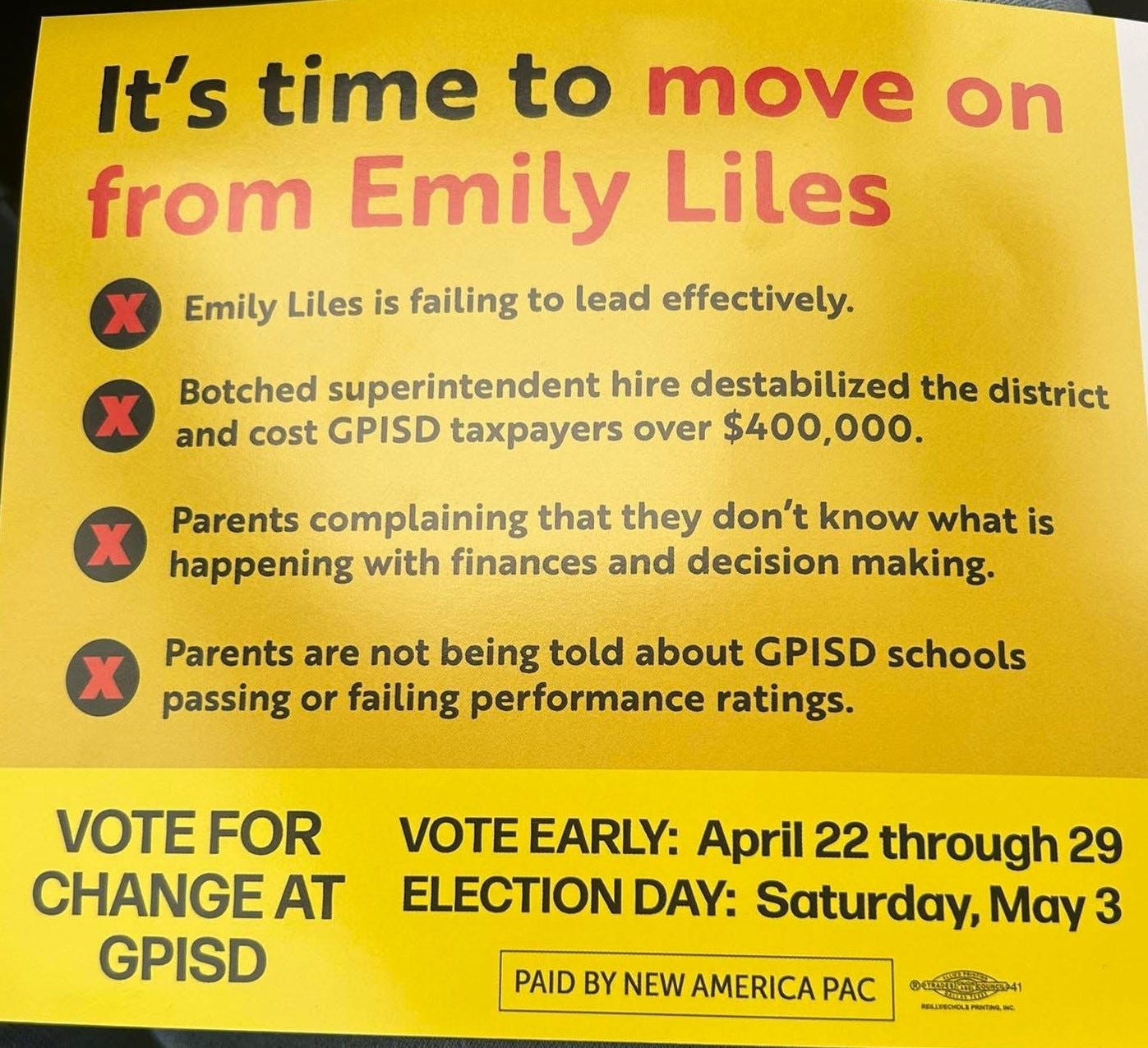 Why the target over Board Trustee Emily Liles? For one, Veronica Lopez, was running in her race. John Lopez (Veronica also donated to John’s campaign), Mike Del Bosque (who contributed to her campaign), and David Espinosa all campaigned on her behalf. Secondly, Emily Liles was one of the two board trustees who were public about their desire to terminate former GPISD Superintendent Dr. Jorge Arredando, who, in his 45-day active tenure, we now know was accused of creating a hostile work environment and discrimination for over 40 nonhispanic females in the district. (More reporting on this in Part Three of this article).