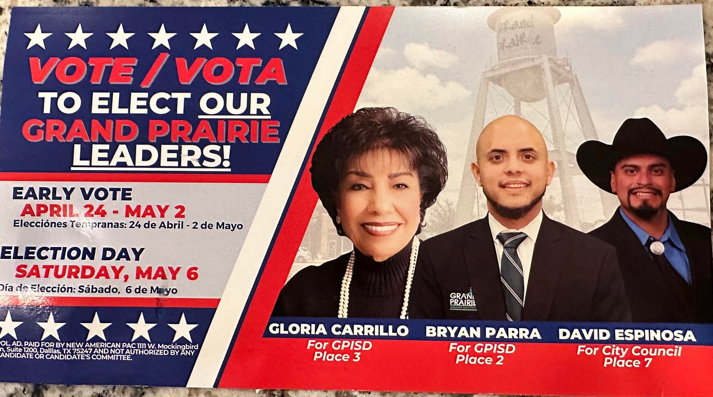 Mr. Copeland’s comments about “John Lopez and his out of town PAC” that “has their own agenda for GP” are in reference to the New American PAC, funded by Lulac President Domingo Garcia. According to Transparency USA, Mr. Garcia has contributed $142,500 to the PAC since it’s inception, at least that has been disclosed. The New American PAC has sent divisive mailers and text messages to Grand Prairie voters in multiple election cycles for different candidates, most recently in the May 2025 school board election of Veronica Lopez and incumbent Emily Liles, which was the subject of our article titled Mudslinging Tactics in Grand Prairie School Board Elections. The mailers are not always negative, as was the case when the PAC sent out mailers (pictured below) to voters in the 2023 election cycle, grouping Gloria Carrillo and Bryan Parra (running for school board), and David Espinosa (running for city council) on one mailer. David Espinosa was serving as a Board Trustee at the time, but decided to run for city council in this election….the same race Dr. Wendy Nguyen-Anaya was coerced into running for as well.