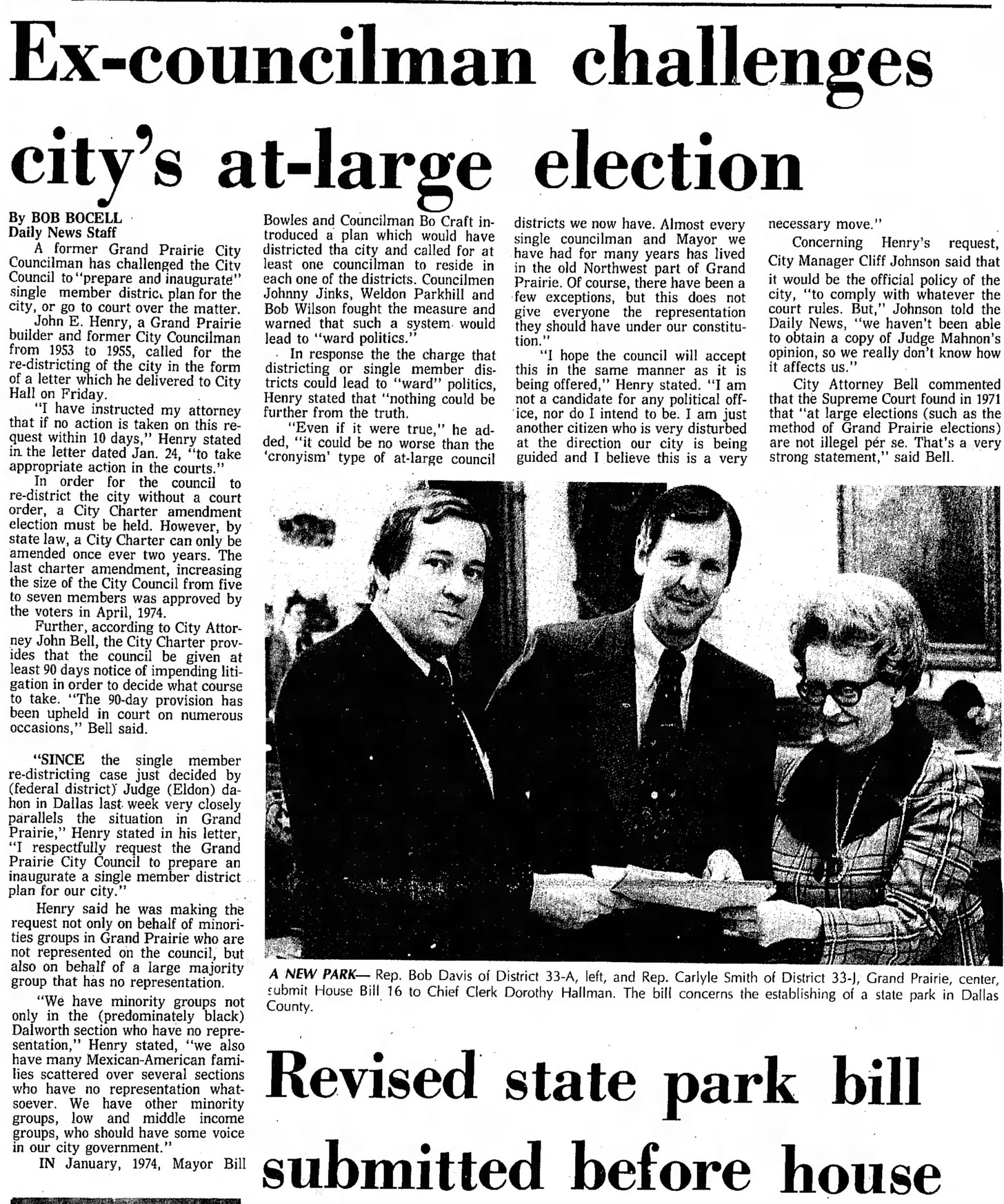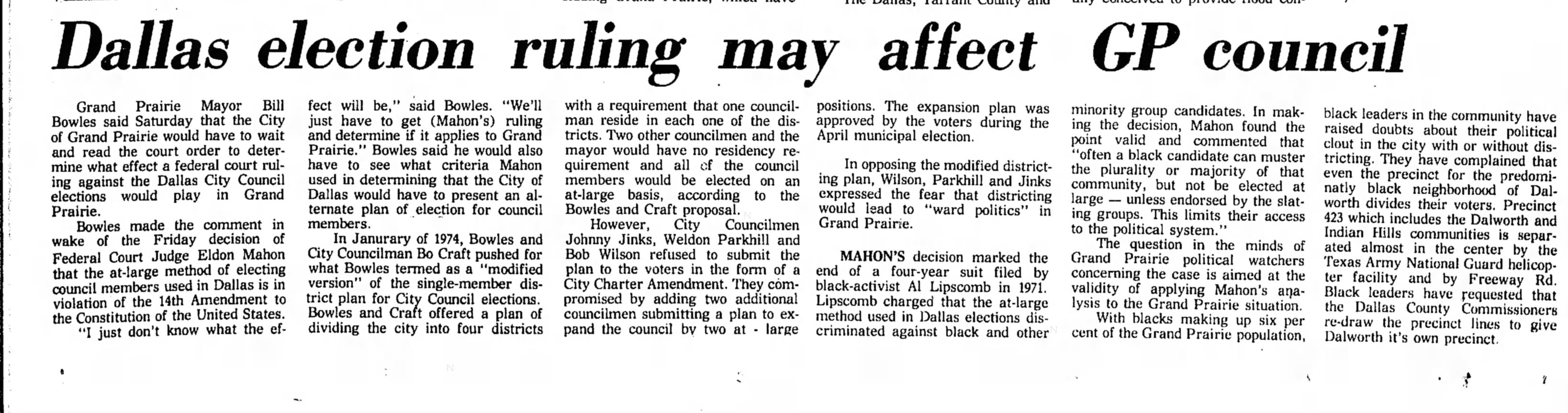A recent conversation between Councilman Junior Ezeonu and Mayor Ron Jensen on Councilman Ezeonu’s FairPlay Politics podcast about gerrymandering got me thinking about representation — not just at the state and federal level, but on city council and our school districts. That reminded me of an old Grand Prairie Daily News article I’d come across a few months ago while researching another project. It was about single-member districts….One clipping led to another, and before long I was in a full-on historical rabbit hole.