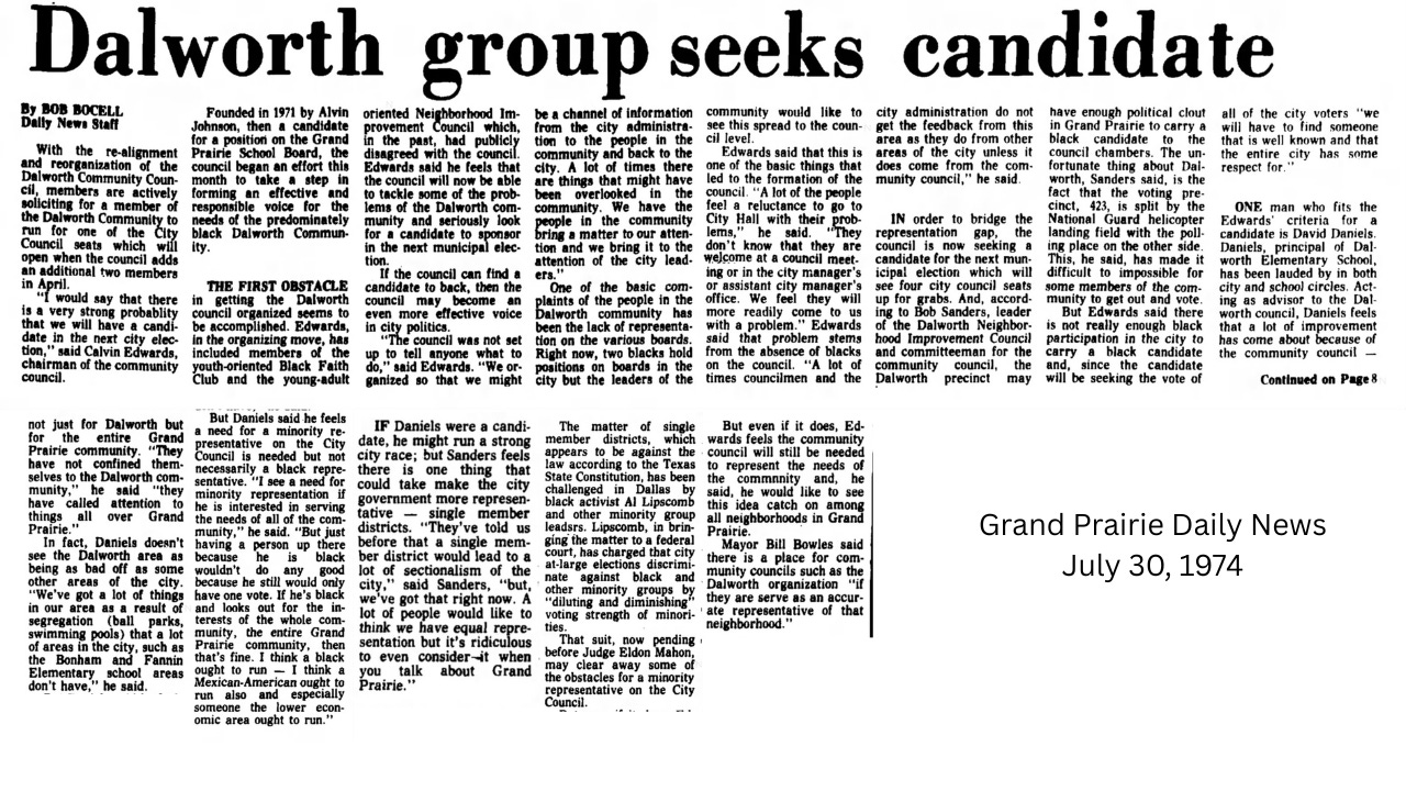 In the 1970s, Grand Prairie, like much of the nation, was coming out of segregation. Dalworth was the Black neighborhood at the time — self-contained, with its own school system, but also home to strong, educated, and persistent leaders. They never stopped pushing for a voice on city council.