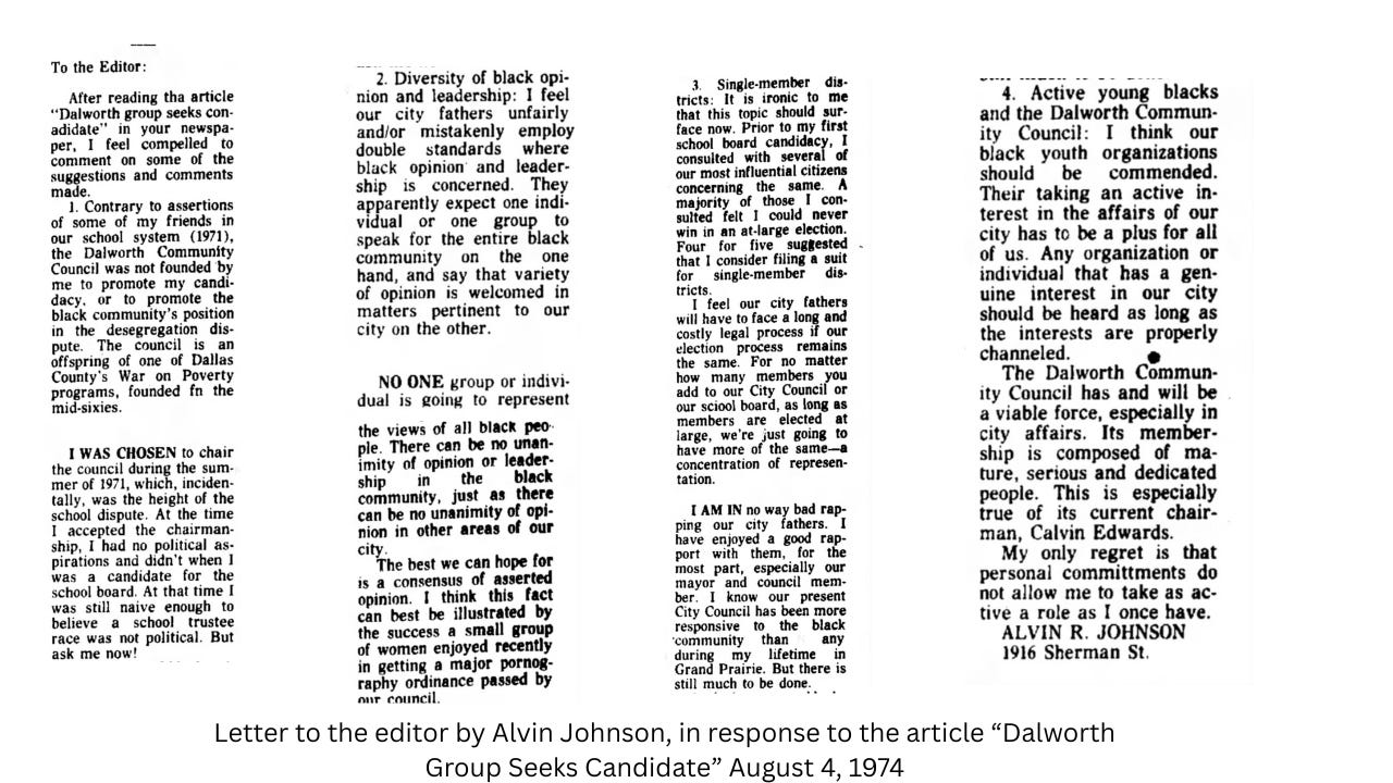 Even within Dalworth, leaders like Principal David Daniels stressed that representation wasn’t about electing someone of a certain race — it was about electing someone who would stand up for Dalworth and still make decisions in the best interest of the whole city. Alvin Johnson, another civic leader, felt differently: after being told he couldn’t win at-large, he came to see single-member districts as necessary.