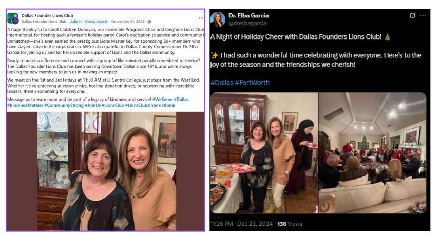 Carol and Dr. Elba Garcia, Dallas County Commissioner and wife of Domingo Garcia, both shared a picture on their socials at a Christmas party for the Dallas Founder Lions Club in December 2024.