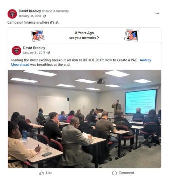 In 2017, David led a session called “How to Create a PAC,” which he shared a year later on his Facebook with the caption “Campaign Finance is where it’s at.”