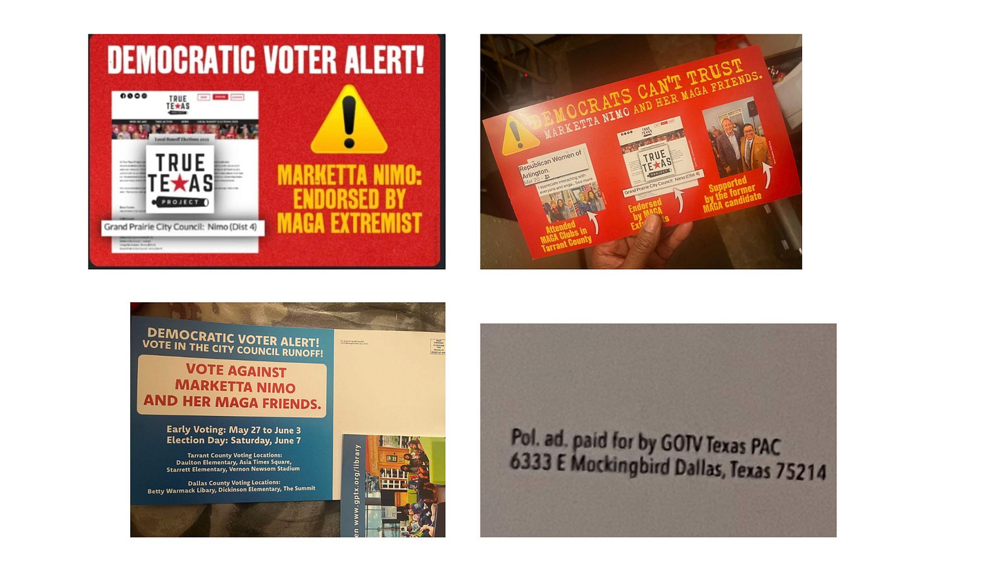 In the second Grand Prairie election of the year, divisive partisan mailers were sent to voters in District 4 by a PAC outside of Grand Prairie. Faces of Grand Prairie reported on the first wave of mailers on April 29, 2025 in the GPISD Trustee Place 6 election, from the New American PAC, which received a donation of $75,000 in 2024 from Dallas Attorney Domingo Garcia. This time, the mailers are being sent to voters in District 4, the location of a city council run off between incumbent John Lopez and challenger Marketta Nimo. Two separate messages were sent to voters, both with highly charged, aggressive, partisan rhetoric intended to scare Democratic voters.