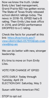 During the Place 6 election with Veronica Lopez and Emily Liles, voters received the following text from David’s wife Susan representing the New American PAC.